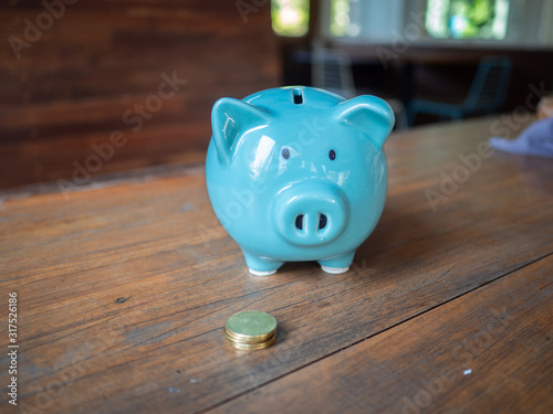 Fototapeta premium Blue piggy bank with coins. The idea of saving money for life