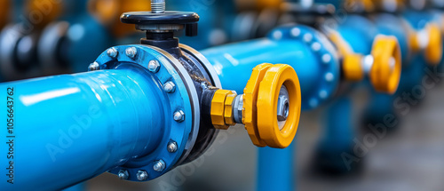 © Ngoc, Fototapeta premium Blue Pipe Valve With Yellow Handle.