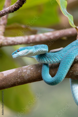 © Fauzi, Naklejka premium blue pit viper wrapped around a wooden branch