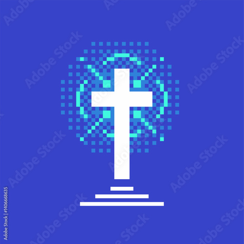 Obraz premium Blue Pixel Art Style Shining Christian Cross, Flat Artwork