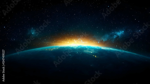 © Hartanto, Obraz premium Blue Planet Earth Rising Above Dark Space With Shining Stars And Golden Sunlight Panorama