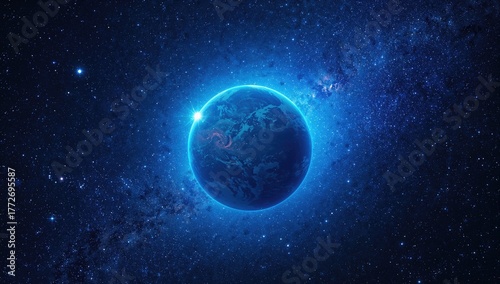 © CreativeBro, Obraz premium Blue planet enveloped by a celestial starry backdrop, illustrating cosmic wonder