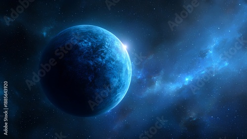 Obraz premium Blue Planet in Deep Space with Stars and Nebula – Futuristic Cosmic Background