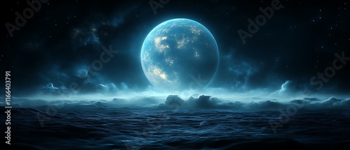 Fototapeta premium Blue planet rising over dark ocean.