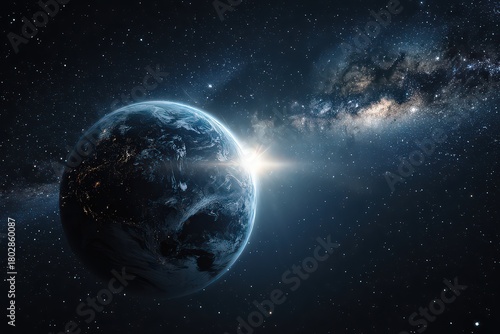 Obraz premium Blue Planet with City Lights at Sunrise Against Starry Galaxy Backdrop in...