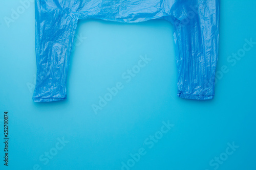 Fototapeta premium Blue plastic bag on the blue background, recycle concept. Top view.