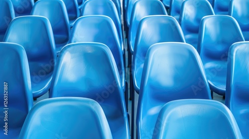© Cherkasova Alie, Fototapeta premium Blue plastic chairs in rows with metal legs on a matching blue background, showcasing repetition and simplicity in design.
