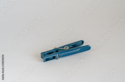 © Mikhail, Naklejka premium Blue plastic clothespin. Image of a single clothespin on a light background. Eye level shooting. Selective focus.