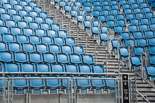 © Michalis Palis, Fototapeta premium Blue plastic empty stadium chairs in a row
