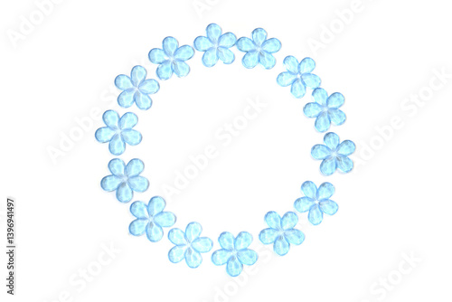Obraz premium Blue plastic flowers in circle frame isolated on white