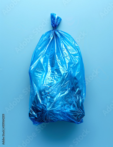 Fototapeta premium Blue plastic garbage bag lies on blue background.