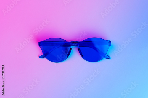 Fototapeta premium Blue plastic glasses for night party, purple neon light, minimalism
