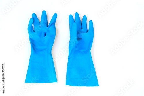 Obraz premium Blue plastic gloves on white background.