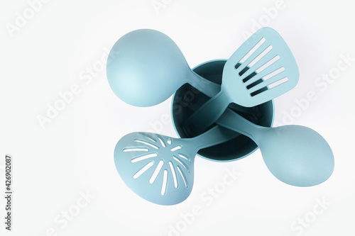 Fototapeta premium Blue plastic kitchen tools for cooking on a white background. Spatulas and...