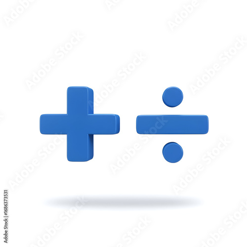© Gofox, Fototapeta premium Blue plus and division symbols in 3D style against a plain white background. Mathematical symbols in a modern, isolated presentation.