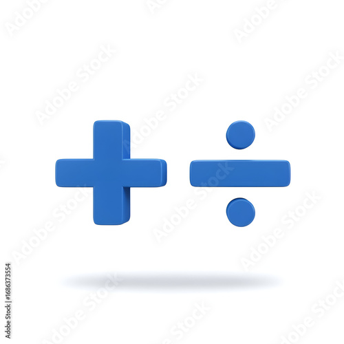 © Gofox, Fototapeta premium Blue plus and division symbols in 3D style against a plain white background. Mathematical symbols in a modern, isolated presentation.