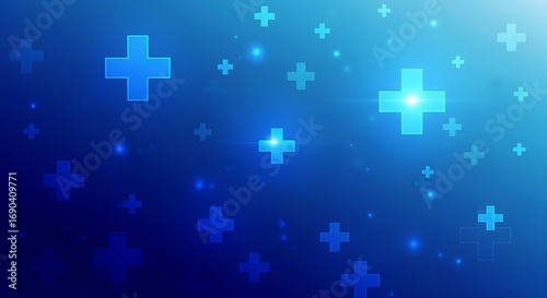 © gs2, Obraz premium Blue plus signs float on a gradient background with sparkling light effects, creating a modern and technological atmosphere.