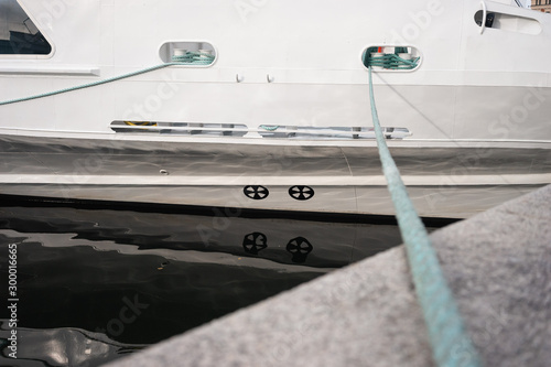 Obraz premium Blue polyester ropes leading up to a boat in stockholm