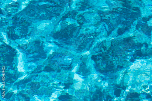 Obraz premium Blue pool water background. Blurred transparent clear calm water surface texture. Water waves in sunlight with copy space.