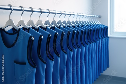 © Tanakorn, Fototapeta premium Blue protective lead aprons hanging neatly on a hospital rack represent vital radiation safety equipment in a clean, professional healthcare clinic