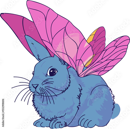 Obraz premium Blue rabbit with pink butterfly wings is resting in stylized flat design,...