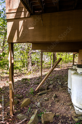 Fototapeta premium Blue Ridge mountains ski resort town with house home building stilts broken from storm or earthquake, danger for accident
