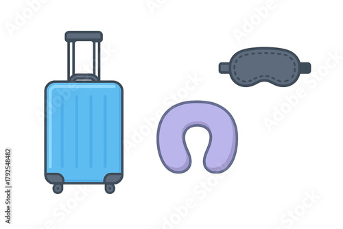© Andrei, Obraz premium Blue rolling suitcase, comfortable neck pillow, and dark sleep mask for essential travel