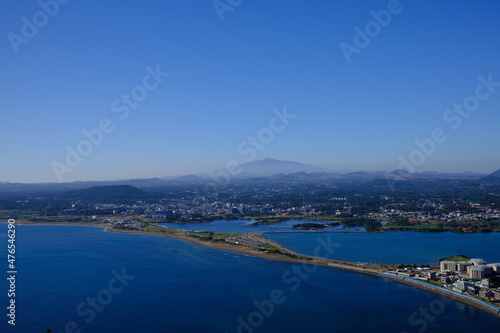 Naklejka premium Blue sea and sky scenery of Seongsan Ilchulbong (UNESCO World Heritage Site) in Jeju Island, South Korea