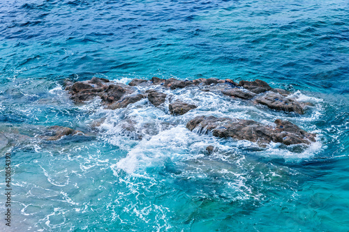 © kemirada, Obraz premium blue sea and waves breaking over the rocks. blue seascape