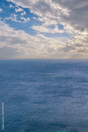 Obraz premium Blue sea with blue sky with clouds, vertical seascape