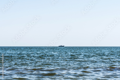 © Aliaksei, Obraz premium blue sea with waves, far away on a horizon line floating ship, nature abstract background