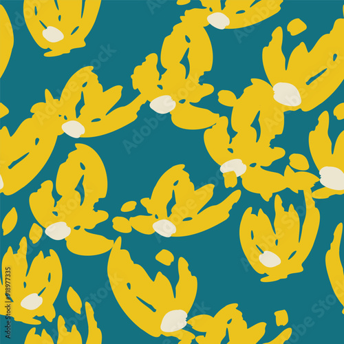 Naklejka premium Blue seamless pattern with abstract yellow flowers. Vector square background,...