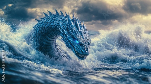 © milenialdesastudio, Obraz premium Blue serpent emerges from turbulent sea.