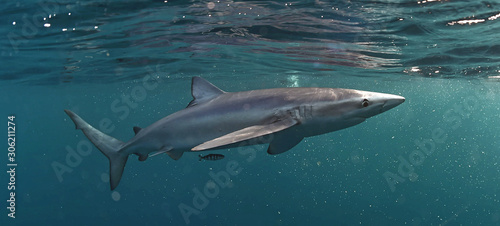 Obraz premium Blue shark swimming in the blue. Scientific name: Prionace glauca. Natural habitat. South Africa.