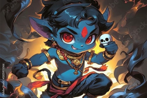 © Tung's companion, Naklejka premium Blue-skinned demon child with red eyes holding skull