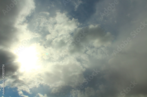 © far700, Fototapeta premium Blue sky and gray clouds. The sun shines through thunderclouds. Background. Landscape.