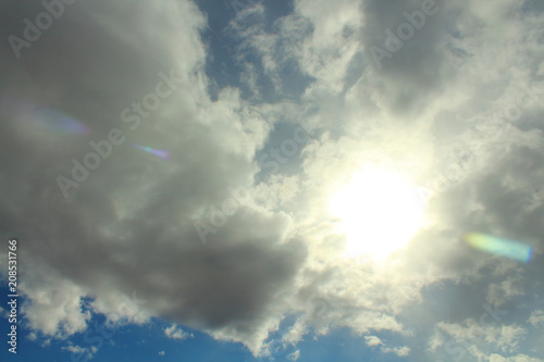 © far700, Fototapeta premium Blue sky and gray clouds. The sun shines through thunderclouds. Background. Landscape.