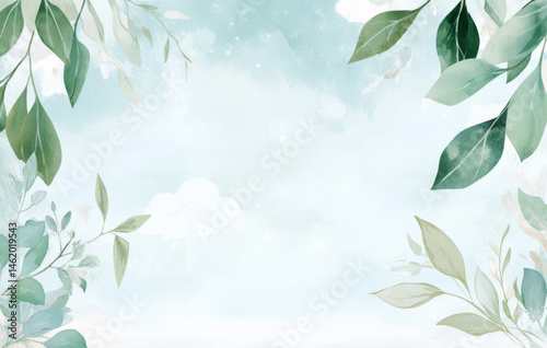 © Top AI images, Naklejka premium Blue sky and white clouds with green leaves border, nature abstract background
