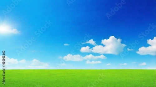 Fototapeta premium Blue sky background, short green grass for the subject, sunny day