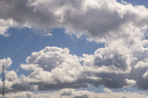 © hiv360, Fototapeta premium Blue sky background with big white tiny stratus cirrus striped clouds
