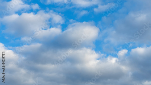 Naklejka premium Blue sky background with clouds. White cumulus clouds in blue sky. Cloudy weather, cloudscape, copy space. Space for text.