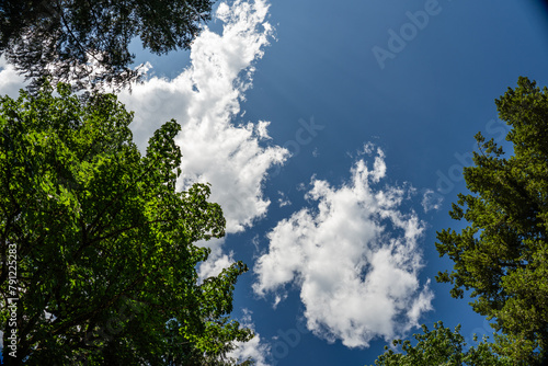 © olegmayorov, Fototapeta premium blue sky background with white clouds and green trees