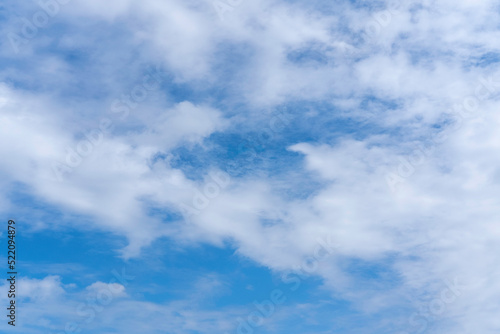 Naklejka premium Blue sky background with white fluffy cumulus clouds. Panorama of white fluffy clouds in the blue sky. Beautiful vast blue sky with amazing scattered cumulus clouds.