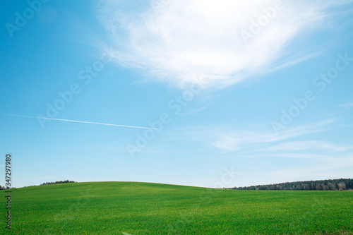 © Evelina, Fototapeta premium blue sky, Bright sun in a white cloud, green field, General plan. Natural background