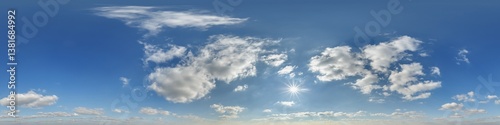 © hiv360, Obraz premium blue sky hdri 360 panorama with pink clouds before sunset with zenith for use in 3d graphics as sky dome or edit drone shot as sky replacement