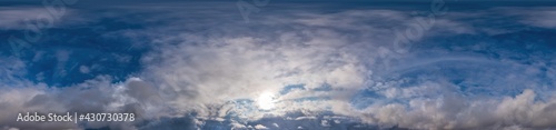 Fototapeta premium Blue sky panorama with Cirrus clouds in Seamless spherical equirectangular format. Full zenith for use in 3D graphics, game and editing aerial drone 360 degree panoramas for sky replacement.