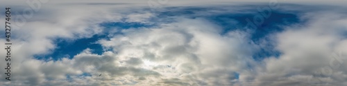 Fototapeta premium Blue sky panorama with Cirrus clouds in Seamless spherical equirectangular format. Full zenith for use in 3D graphics, game and editing aerial drone 360 degree panoramas for sky replacement.