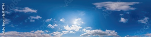 Fototapeta premium Blue sky panorama with Cirrus clouds in Seamless spherical equirectangular format. Full zenith for use in 3D graphics, game and editing aerial drone 360 degree panoramas for sky replacement.