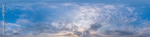 Fototapeta premium Blue sky panorama with Cirrus clouds in Seamless spherical equirectangular format. Full zenith for use in 3D graphics, game and editing aerial drone 360 degree panoramas for sky replacement.