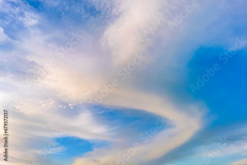 Obraz premium Blue sky with chemical chemtrails cumulus clouds scalar waves sky.